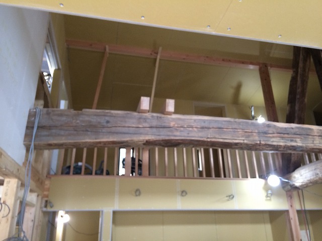 天井には太い古材の梁が掛けてありなかなか趣のある感じになるのではないかと期待しております。